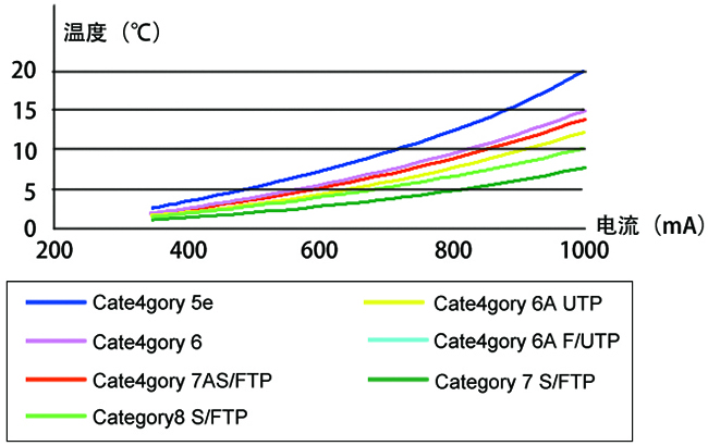 從圖表我們可以看到,隨電流增大,網(wǎng)線(xiàn)的溫度也隨著(zhù)增加。當相同電流時(shí),網(wǎng)線(xiàn)類(lèi)別越高,溫度越低。