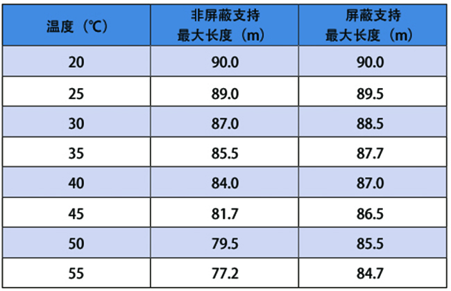 下圖為不同環(huán)境溫度下網(wǎng)線(xiàn)支持的最大長(cháng)度: